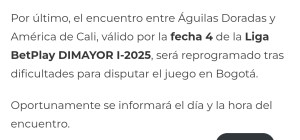 Este fin de semana, la División Mayor del Fútbol Colombiano (Dimayor) confirmó que aún no hay una fecha definida para el partido entre Águilas Doradas y América de Cali.