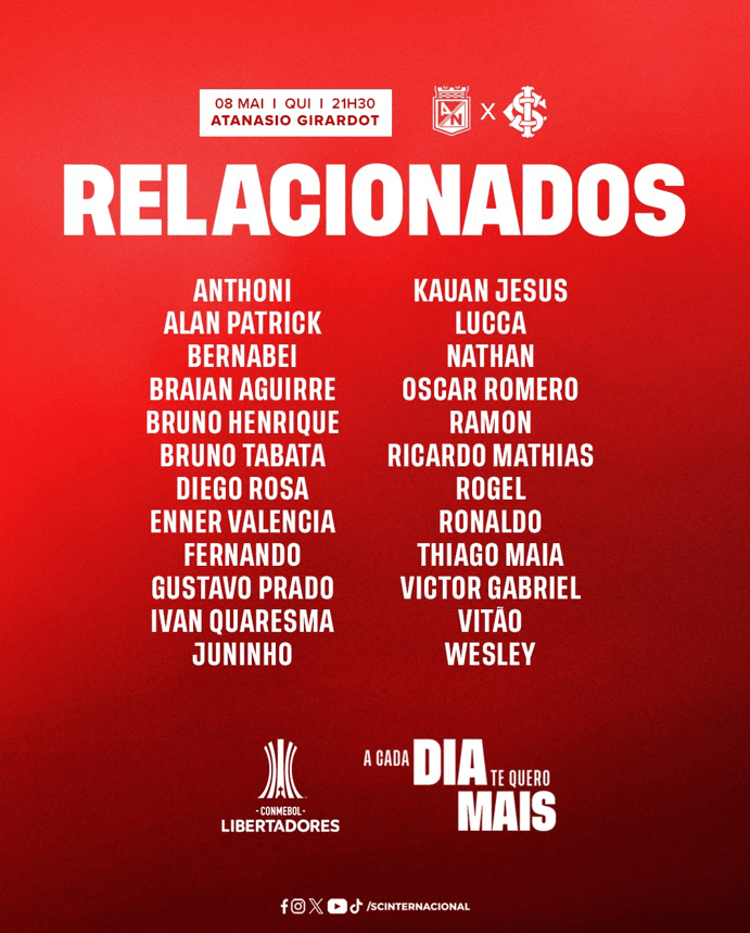 Internacional: Anthoni; Braian Aguirre, Vitão, Victor Gabriel, Alexandro Bernabei; Fernando, Thiago Maia, Tabata, Alan Patrick, Wesley, Enner Valencia.