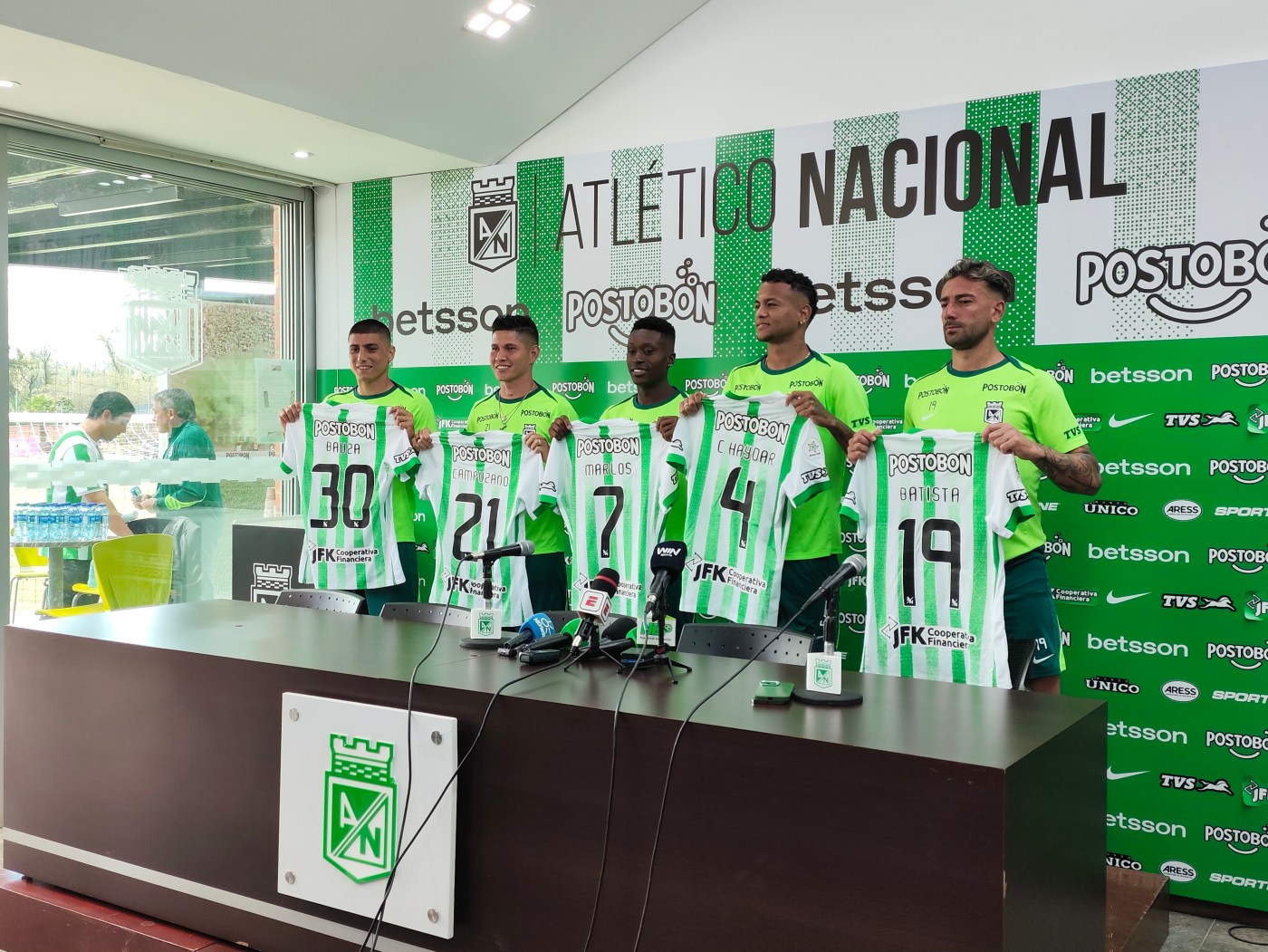 Este miércoles 30 de julio, Atlético Nacional, en cabeza de su presidente Sebastián Arango y su gerente deportivo Gustavo Fermani, presentó oficialmente a las cinco nuevas incorporaciones que llegan para reforzar al equipo verdolaga.